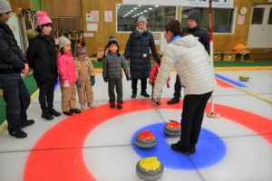 つるつるの氷の上でストーンを滑らせて、ブラシでごしごしスイープにも挑戦。