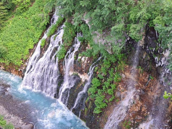 | 「白ひげの滝」のパワースポットは必見 | 「神秘的なコバルトブルーの絶景!美瑛川に注ぐ『白ひげの滝』は必見のパワースポット」 岩の隙間から染み出た地下水が、美しい青色の美瑛川(ブルーリバー)へ勢いよく流れ落ちる珍しい滝。冬には滝が凍りつき、ライトアップされた幻想的な氷瀑が見られます。「青い池」と合わせて訪れたい、美瑛を代表する神秘的な観光名所です。 |