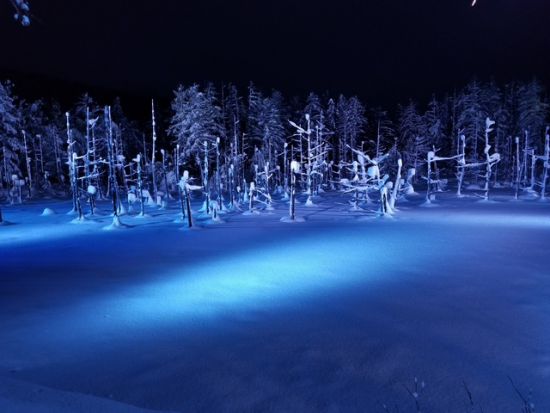 | Experience the Mystical | A mystical cobalt blue water surface spreads out at this representative tourist attraction of Hokkaido. The Blue Pond, which shows various expressions depending on the season and weather, is a spectacular spot that captivates even photography enthusiasts. Biei's "Blue Pond" became a popular destination for tourists from around the world after being adopted as Apple's Mac desktop wallpaper in 2012. The fantastical blue color created by highly transparent water reflecting sunlight makes for a photogenic subject with any camera. Photography Tips: The pond appears most brilliantly blue on sunny mornings. We recommend compositions that take advantage of the contrast between the dead standing trees and the blue water surface. |