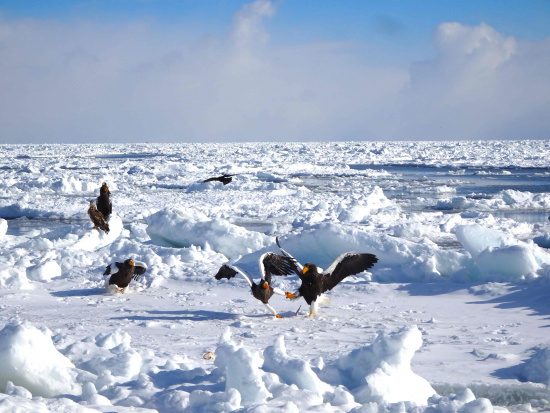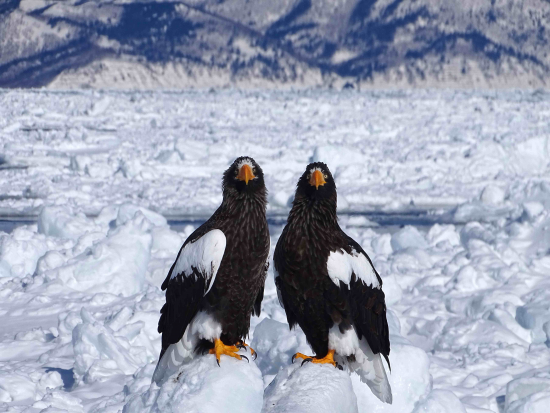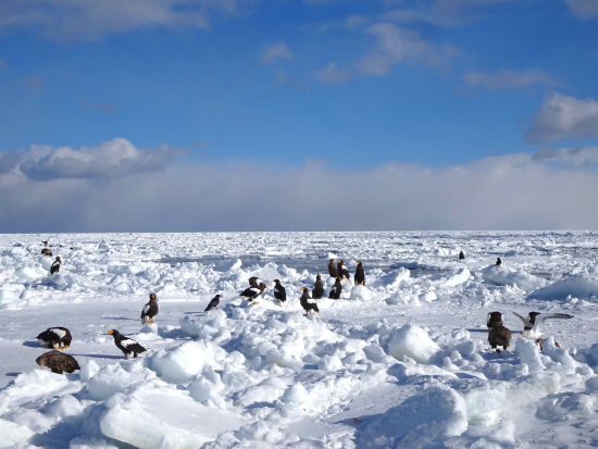 流氷とともに訪れるオオワシ・オジロワシ、そしてアザラシたちの命のドラマを船上から観察。
