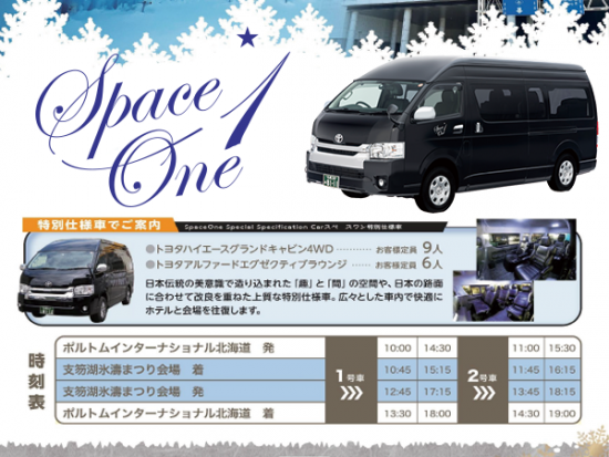 | <Car 2: Morning / Afternoon> | 11:00 / 15:30 Depart: Portom International Hokkaido ||| 11:45 / 16:15 Arrive: Lake Shikotsu Ice Festival Venue ||| ~Free Time (Approx. 2 hours)~ ||| 13:45 / 18:15 Depart: Lake Shikotsu Ice Festival Venue ||| 14:30 / 19:00 Arrive: Portom International Hokkaido |