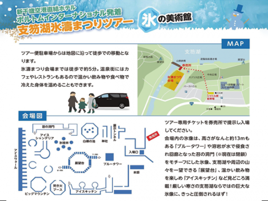 | 料金に含まれているもの | Round-trip luxury transfer Lake Shikotsu Ice Festival Admission Fee (Contribution) Consumption Tax |