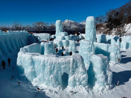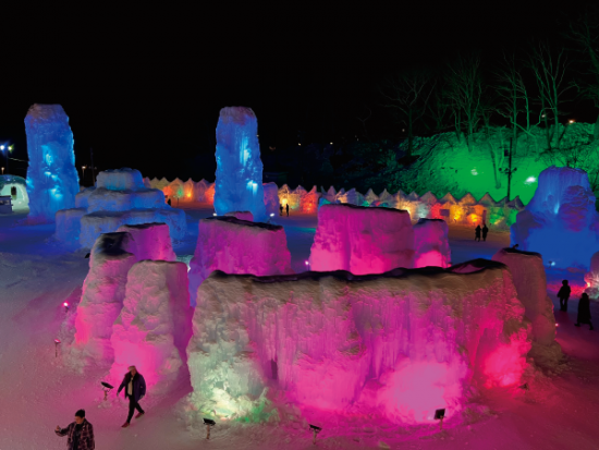 This festival features massive ice sculptures created by spraying the crystal-clear water of Lake Shikotsu—Japan's northernmost ice-free lake—which freezes into magnificent shapes. During the day, the ice shines in a natural cobalt color known as "Shikotsu Blue." At night, the sculptures are illuminated with colorful lights, creating a fantastic, otherworldly atmosphere. Don't miss the 13-meter tall "Blue Tower" and the panoramic observatory!.