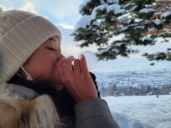 凍ったジャンボシャボン玉を北星山展望台に残す体験