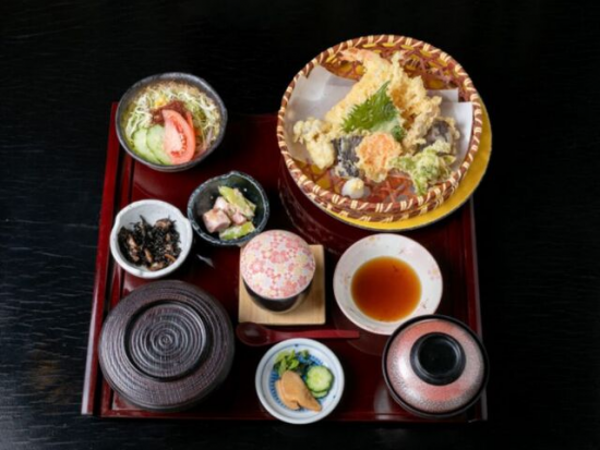 | 昼食(旬食茶寮むらもと) | 「むらもと」は、菊池の豊かな自然と水に支えられた食文化を大切にする、地域に根ざした食事処です。 観光地化されすぎていない、地元ならではの温かなおもてなしとともに、旬の食材を使った和食をお楽しみいただけます。 旅の途中で、日本の地方の暮らしや食の魅力を感じられる、心安らぐ昼食時間をお過ごしください。 詳細:天ぷら、小鉢2種、茶碗蒸し、サラダ、白飯、汁物、漬物 |