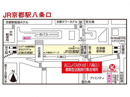 | 集合場所 | ・住所:京都府京都市南区東九条西山王町31番地の6 ※JR・地下鉄・近鉄 京都駅八条通側出口を出ると、左手前方に京都アバンティの建物が見えます。そのまま京都アバンティを右手に見ながら直進してください。 しばらく進むと京阪バス八条口案内所の入口が見えてきます。入口前が H2 のりばです。 ※受付終了後、スタッフが貸切バス乗降場までご案内いたします。スムーズなご案内のため、お客様ご自身で乗降場へ直接向かわず、H2 のりば付近にて受付をお済ませください。 |