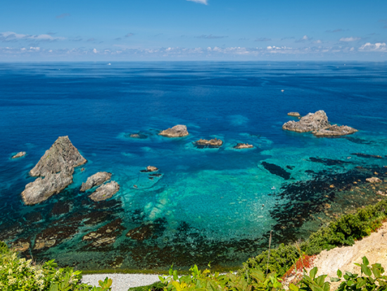 本コースで訪れるのは「神威岬」と「島武意海岸」、そして美国漁港の「積丹水中展望船 ニューしゃこたん号」。