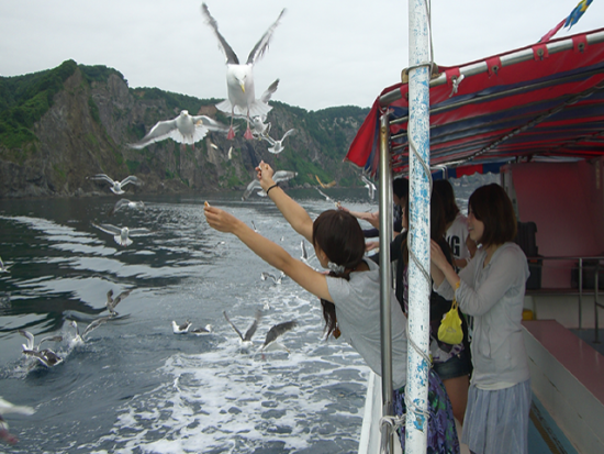 美国漁港のニューしゃこたん号は、北海道でも数少ない水中展望船。船内の窓から海中を眺めることができ、エメラルド色の海や奇岩、目の前を泳ぐ魚の姿など、変化に富んだ景色が鑑賞できます。さらに、様々な景色を楽しんだ帰路にはカモメへのエサやり体験を行うことも!※