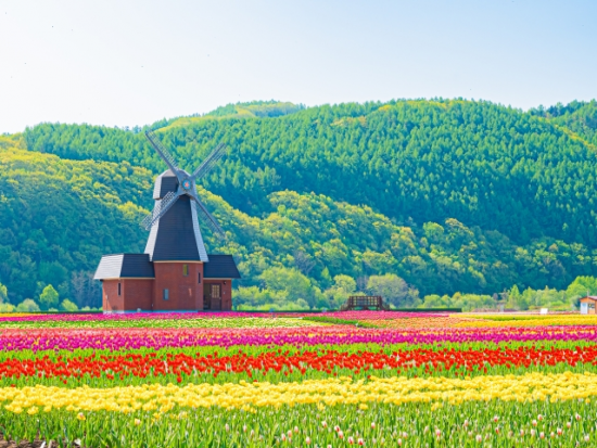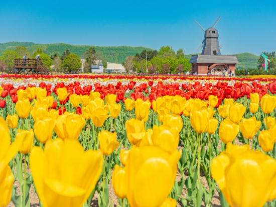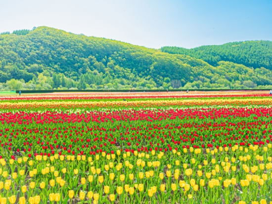 メインスポットのかみゆうべつチューリップ公園では、色鮮やかなチューリップ畑をゆっくり散策。